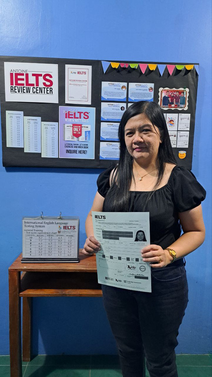 I highly recommend Antoine IELTS Review Center. The teachers are very passionate, dedicated, and knowledgeable in teaching their students. I have no idea even a single about IELTS, how it will be because the only thing that I am thinking is I need to go to Canada. Also, I'm afraid of any English test. But after I enrolled with Antoine and started my review, in just a very short time I had the courage to take the exam and reached beyond my target band score.